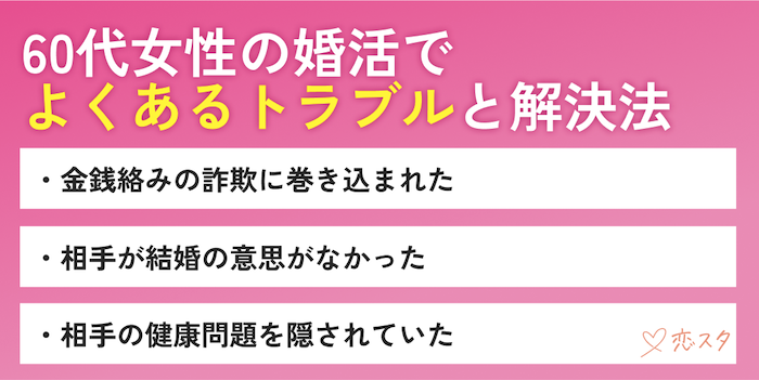 そこで60代女性の婚活でよくあるトラブルを3つご紹介!